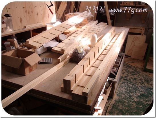 침대의 사다리 부분과 다리를 만들고 있어요.