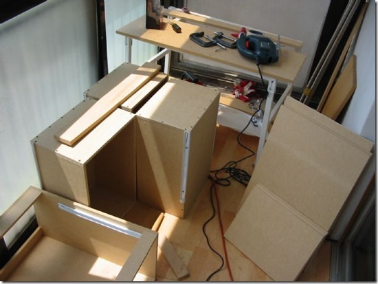 그리고 벽장의 외곽 틀을 조립했죠. 무게를 받지 않는 위판은 18mm 집성목이고 아래판은 24mm 썼습니다. 사진은 정확한 직사각형이 되는지 모서리 90도 확인 작업. ^^