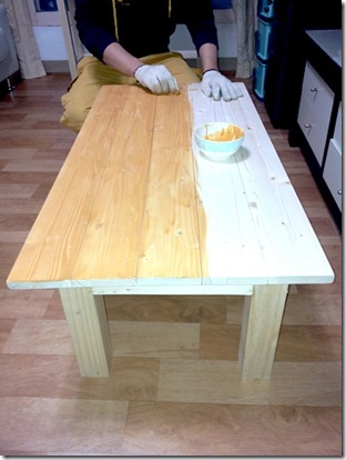 스테인 바르고 말리는 중입니다. 상판은 초록색으로 다리는 투명으로...